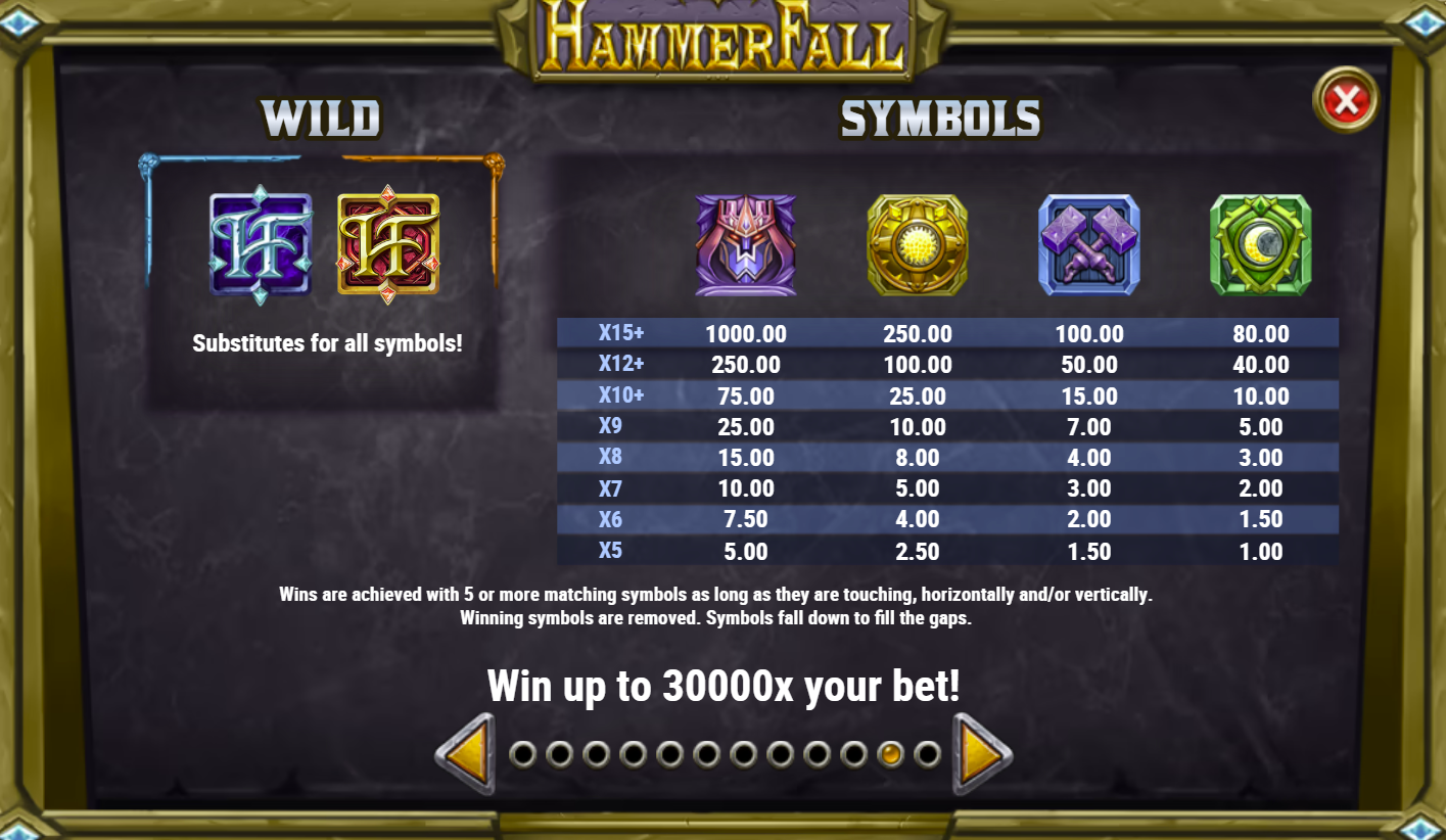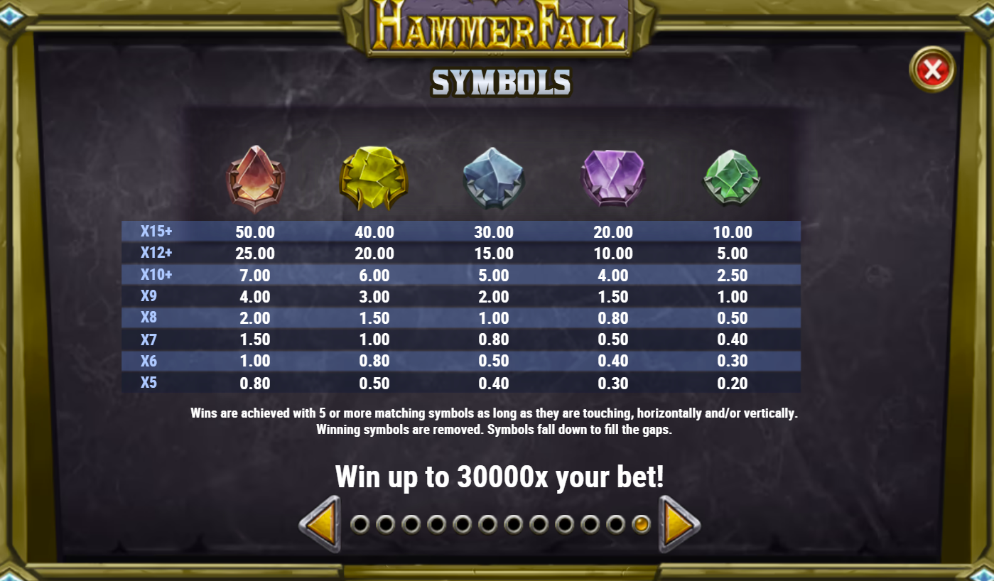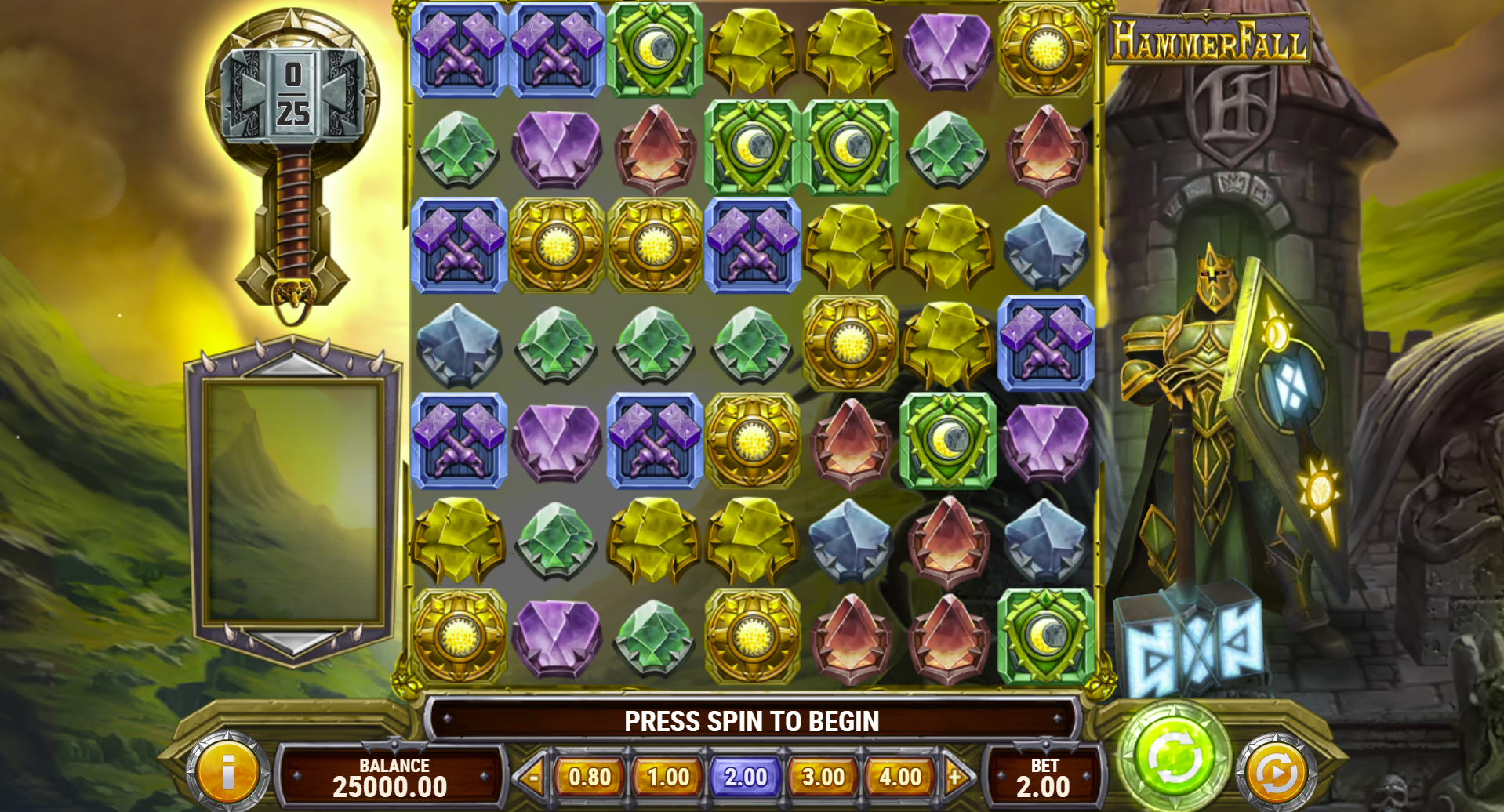 Hammerfall is a high-octane slot that lives up to its name. The 5x5 grid and 3,125 ways provide a dense canvas for the colossal 2x2 and 3x3 symbols to dominate the screen, creating chain reactions of wins from a single symbol drop. The base game is kept lively by the random Hammer feature, which provides satisfying, guaranteed wins and breaks up potential dry spells typical of high-volatility games.